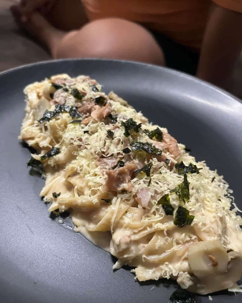 - Stir in the tuna, a scoop of powdered milk, a generous amount of Parmesan, and a drizzle of olive oil. Watch as the powdered milk works its magic, creating a creamy sauce.